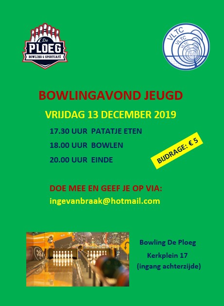 Op vrijdag 13 december vindt onze jaarlijkse bowlingavond plaats. Doe jij ook mee? We beginnen om 17.30 uur gezamenlijk met een patatje en een snack. Daarna gaan we bowlen en we sluiten de avond om 20.00 uur af. Bijdrage: € 5.